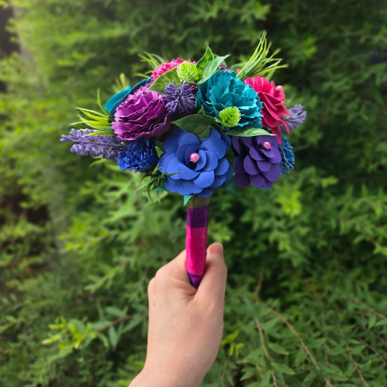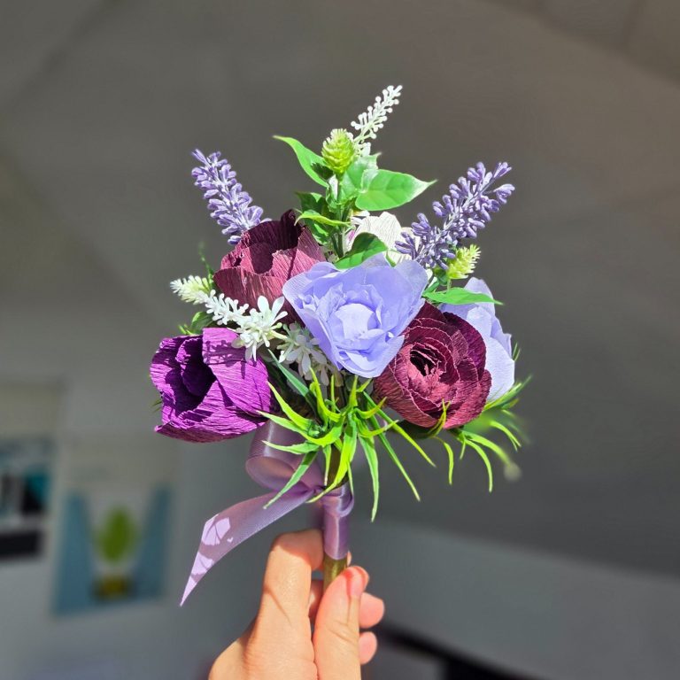 This posy is made from crepe paper flowers in a tulip and ranunnculus style with lots of greenery.