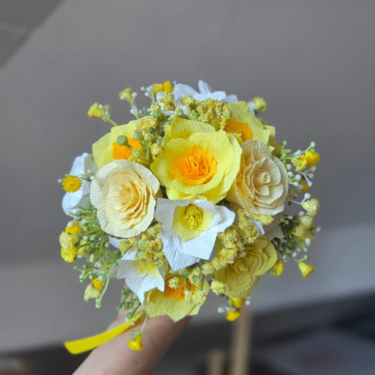 This bouquet is made from crepe paper in the colour of your choice and includes full narcissus flowers, gardenias and gypsophilia