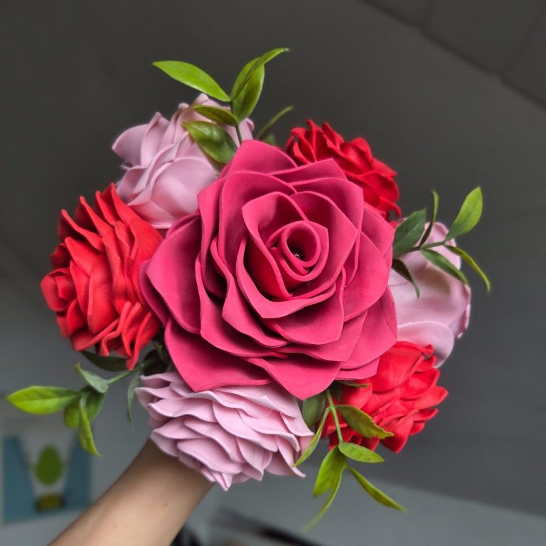 Classic full bloom roses in various sizes and can be made in any colour. These roses are made from EVA foam and have leaves added either in the bouquet or underneath it.